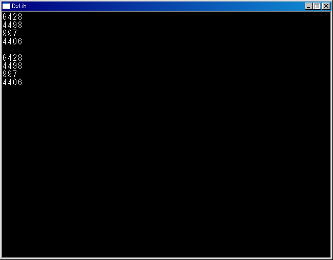 printfDx("%d\n",GetRand(10000)); //0〜10000までの乱数を生成,画面に出力