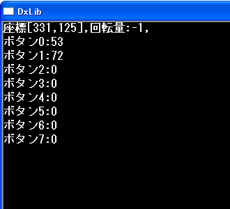| サンプル 各マウスボタンを押したカウント数、ホイール回転数、マウスポインタのある座標が表示されます。 #include "DxLib.h"