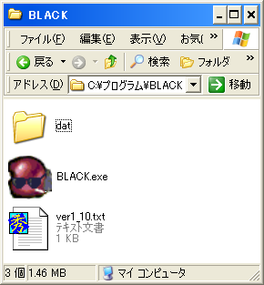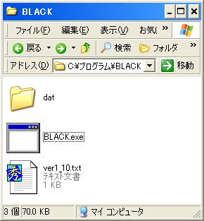 例えば私の作ったゲーム「BLACK」で、アイコンを付けていないとこんな感じになります。BLACK.exeを実行するとゲーム開始です。