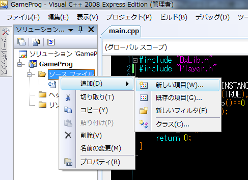 今回、「Player.h」というファイルも必要なので、先ほどと同様に「追加」 > 「新しい項目」から