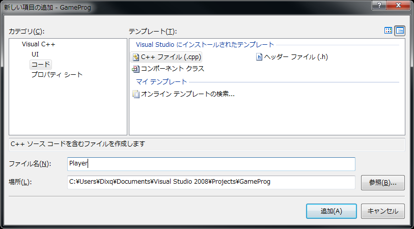 出てきた「新しい項目の追加」ウィンドウで「C++ファイル (.cpp)」を選択し、「ファイル名」に「Player」と入力し、「追加」を押します。