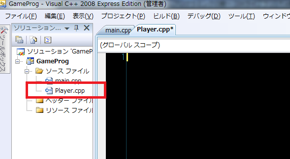 下の画像のように、ソリューションエクスプローラーに「Player.cpp」が追加されました。
