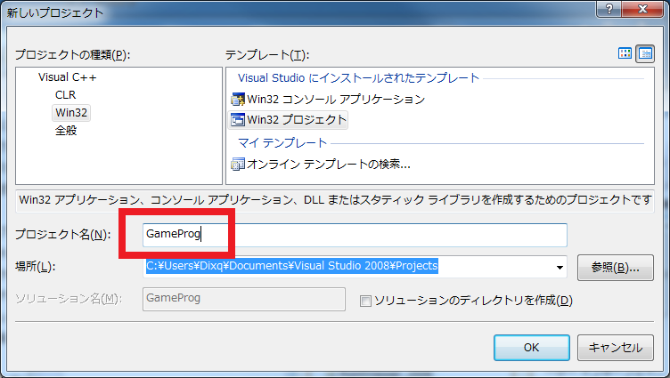 「Win32プロジェクト」が選択されていることを確認して、「プロジェクト名」に好きなプロジェクト名を入力します。(何でも構いません)