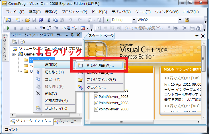 左側にソリューションエクスプローラーが表示されるので、「ソースファイル」のところで右クリックし、「追加」>「新しい項目」を選択します。
