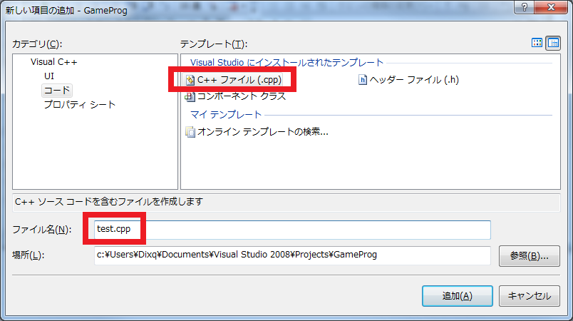 「C++ファイル」を選択し、「ファイル名」に好きな名前を入力します。