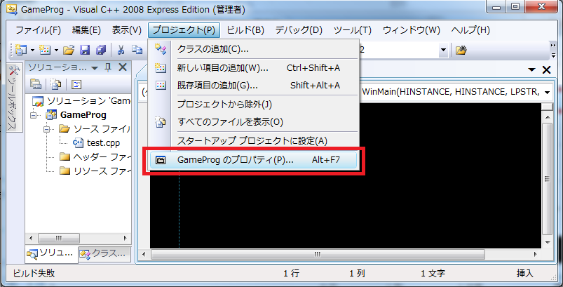 「プロジェクト」>「(プロジェクト名)のプロパティ」を開きます。
