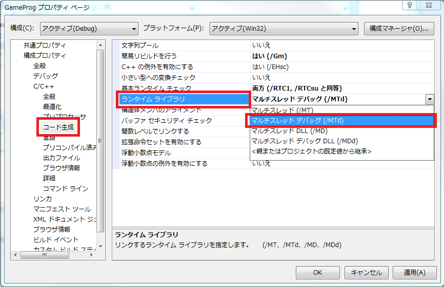 「ランタイム ライブラリ」で「マルチスレッド デバッグ (/MTd)」を選択します。(これは左上の「構成」が(Debug)になっている時に設定するものです)