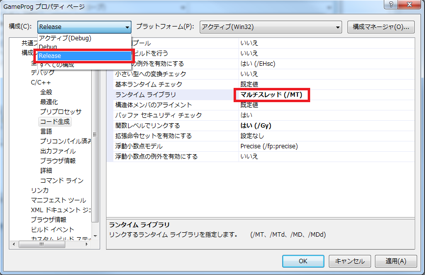 画面左上の「構成」を「Release」にして、先ほど変更したのと同じ「ランタイム ライブラリ」を「マルチスレッド(/MT)」に変更します。