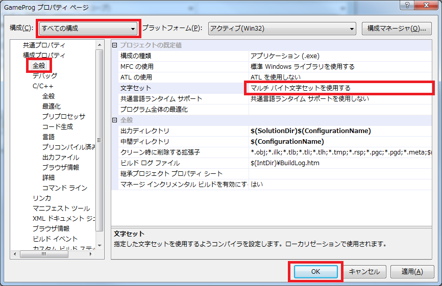 「構成」を「全ての構成」にし、「全般」を選択し、右側の「文字セット」を「マルチバイト文字を使用する」にします。