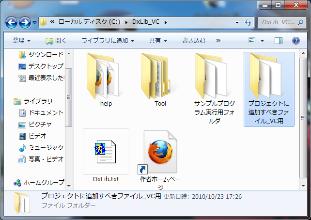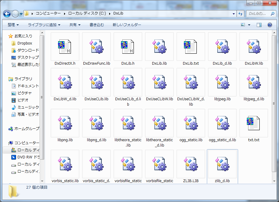 このフォルダの中身を、先ほど作った「DxLib」フォルダにコピーして下さい。