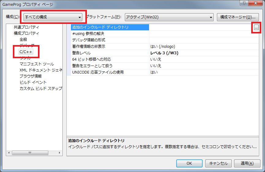 続いてincludeするDxLibのパスの設定です。その画面のまま、C/C++をクリックし、「追加のインクルードディレクトリ」の右側の「...」をクリックします。