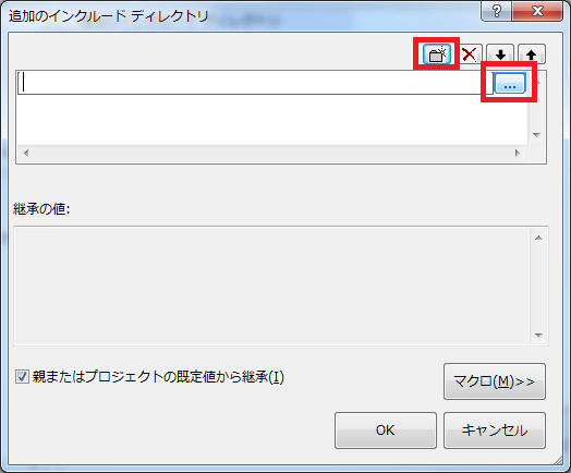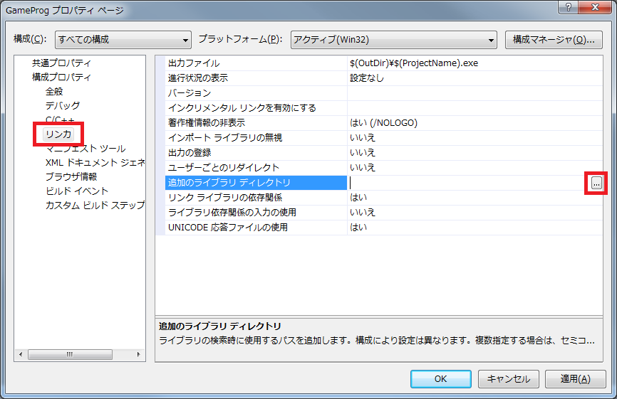 次に「リンカ」を選択し、同様に「追加のライブラリディレクトリ」の「...」を選択します。