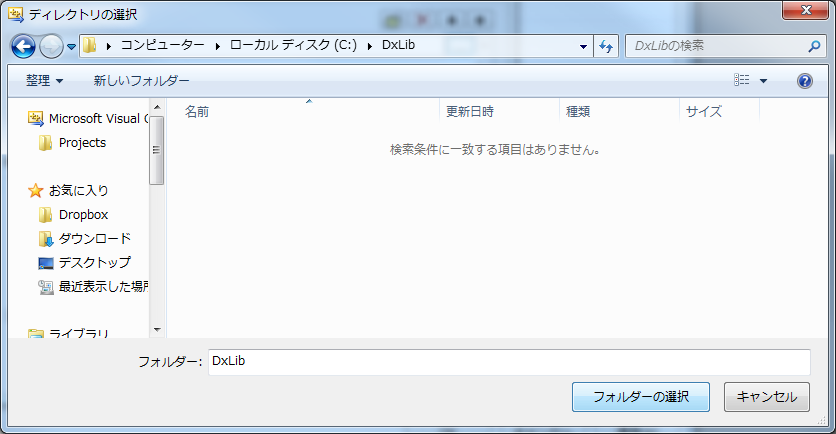 そして、先ほど作ったCドライブ直下にある「DxLib」フォルダを選択し、「フォルダーの選択」を選択します。