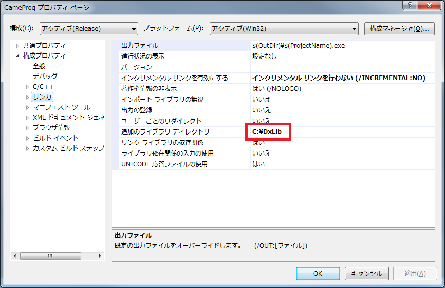 上記のようにC:\DxLibが設定されていることを確認して下さい。