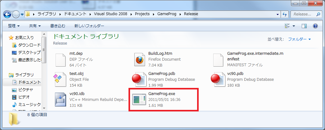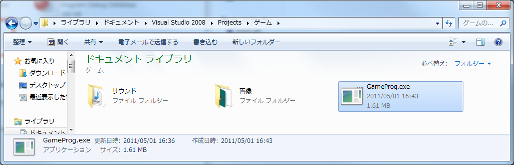 実行ファイルが生成されています。この「プロジェクトファイル名.exe」がゲームの実行ファイルです。