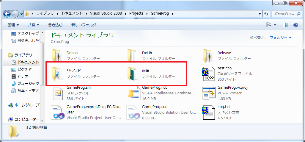 本サイトでいえば「サウンド」フォルダと「画像」フォルダです。