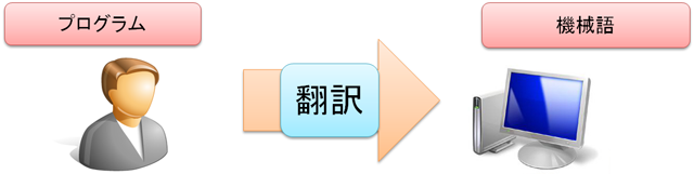 「プログラム」と呼ばれる翻訳機にかけられるルールに従った人間に分かる言葉を、翻訳機にかけることで、「機械語」に変換することができ、
