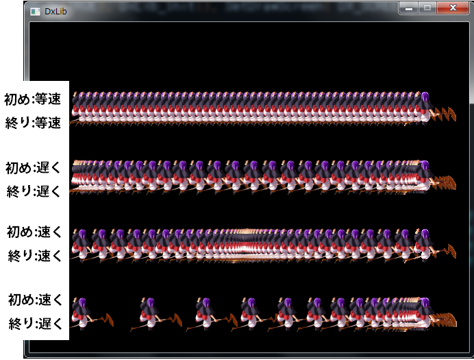 例えば一番上は、初めも終わりも等速指定なので、変化なく、等速で移動しています。