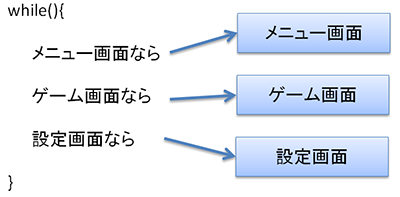 こんな感じでメインループの中から、現在何の画面(シーン)なのかという情報を元に処理を分岐させてみましょう。
