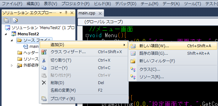 ソリューションエクスプローラーの「ソースファイル」を右クリックして「追加」>「新しい項目」を選びます。