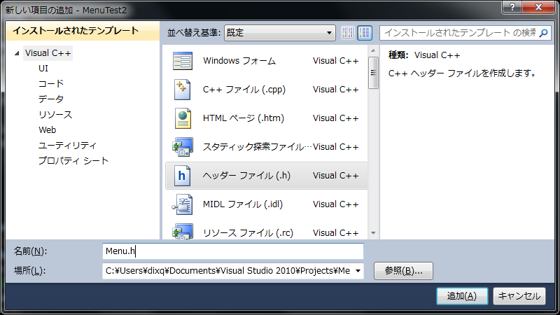 「ヘッダーファイル」を選択し、「名前」欄に「Menu.h」を入力して「追加」をクリックします。