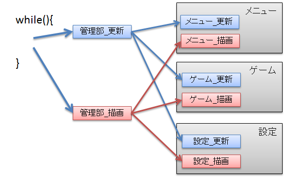 SceneMgrはScene変数に指定されたシーンの識別子を入れ、以降管理部はそのシーンのモジュールをコールするようになります。