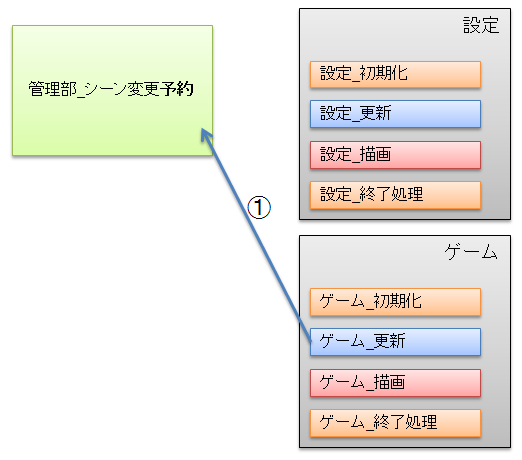 シーン変更予約を受け付けると、管理部は一旦すぐに処理を返します。
