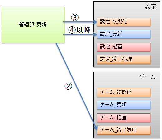 まず、ゲーム画面の更新部から管理部へ