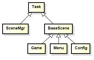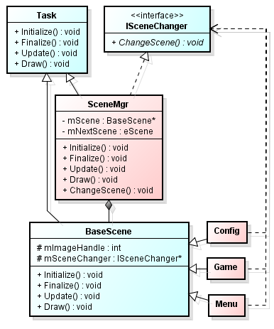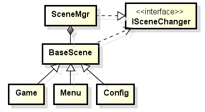 SceneMgrはGame、Menu、Configと言ったクラスのインスタンスを直接持ちません。