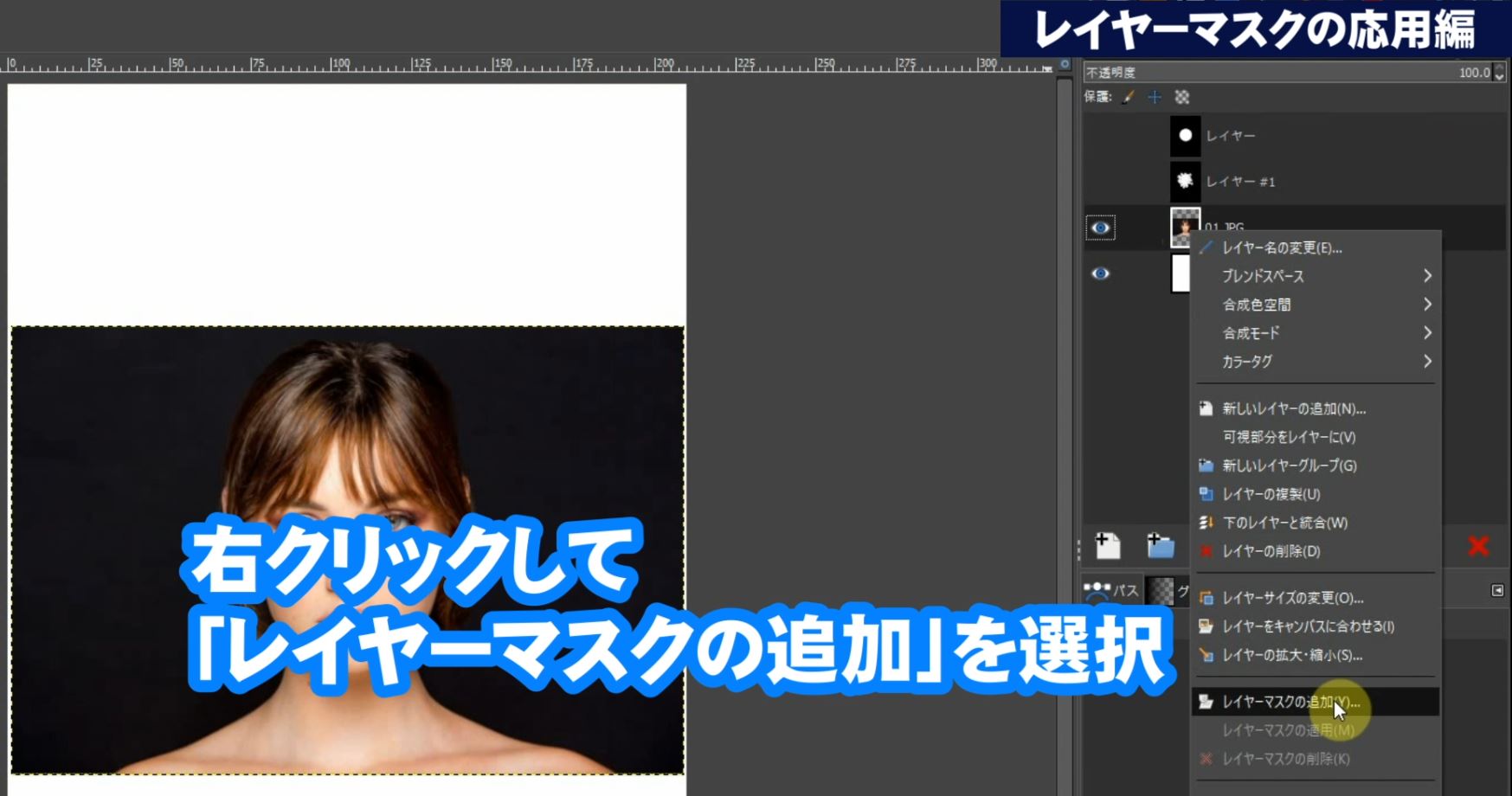 人物写真のレイヤーを選択して右クリック「レイヤーマスクの追加」を選択します。