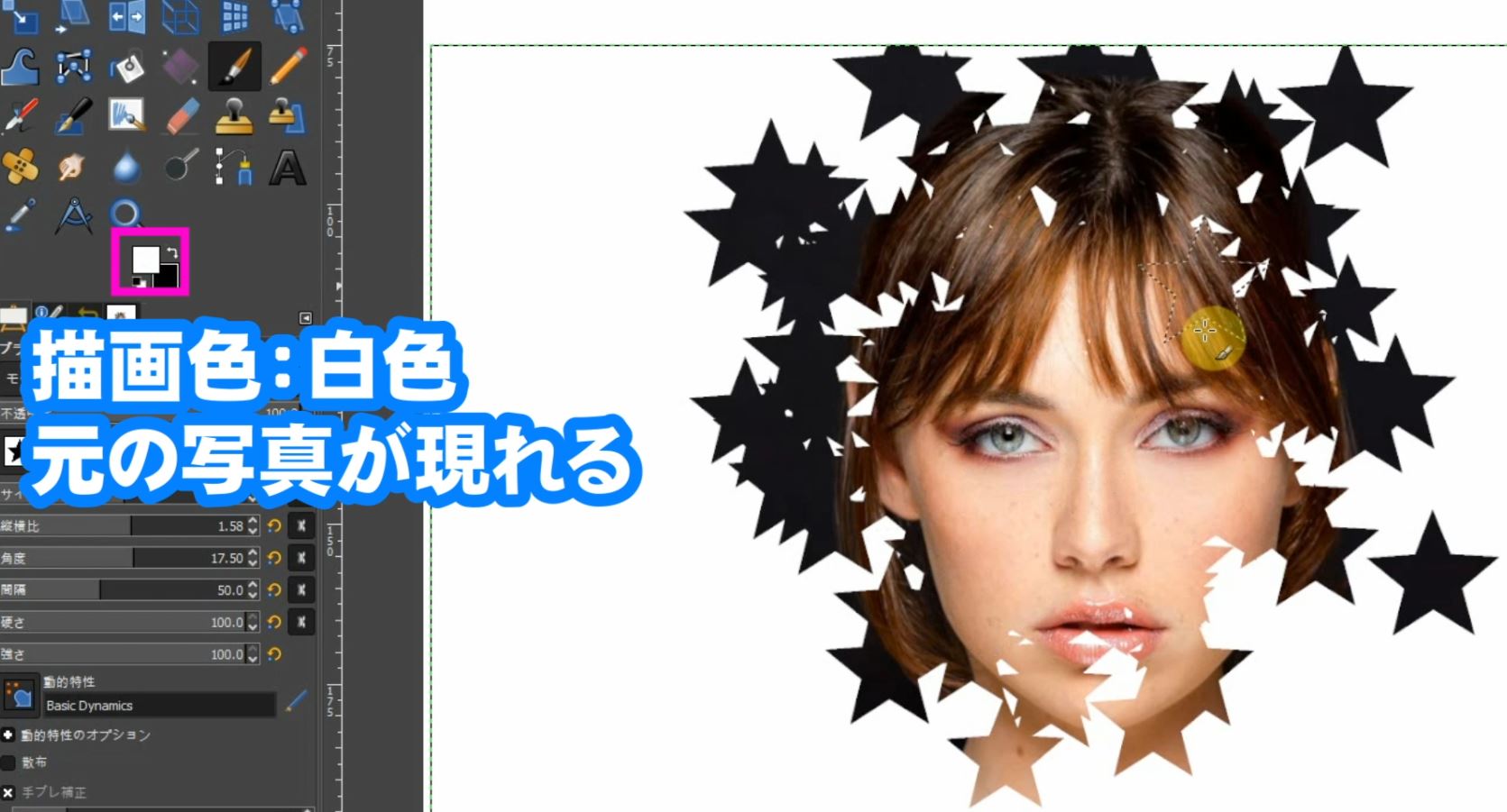 描画色を白色にして人物の顔の部分をなぞると、元の写真が現れてきます。