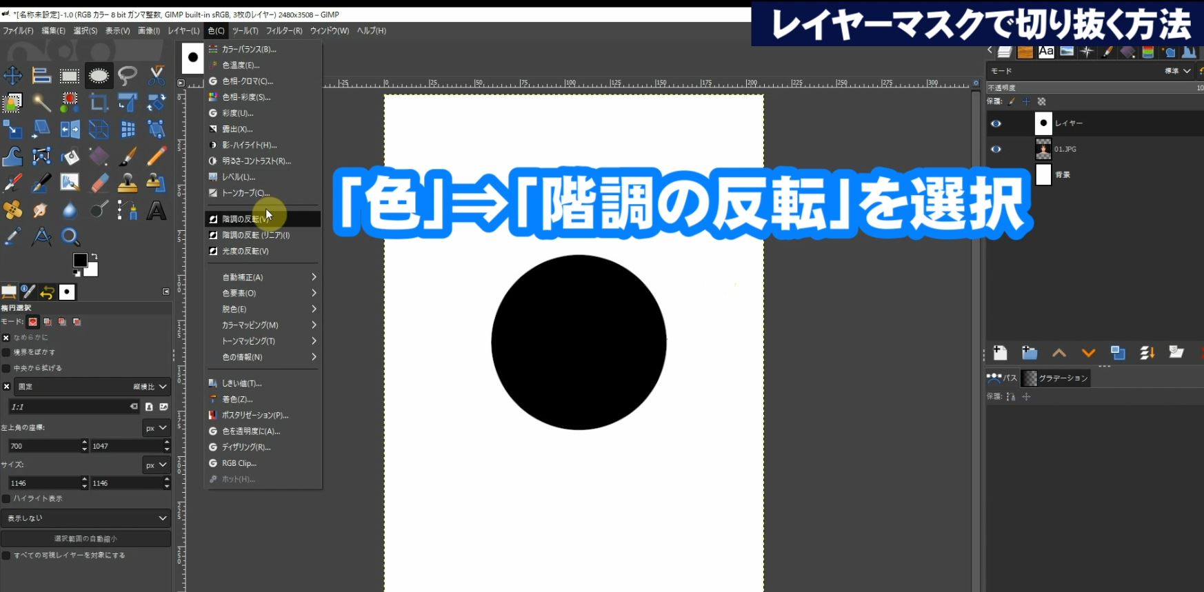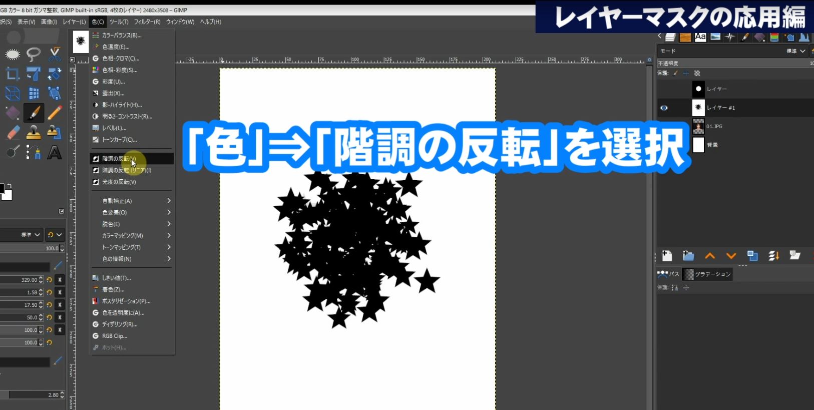 「色」⇒「階調の反転」を選択して階調を反転させます。