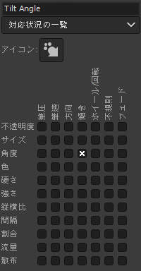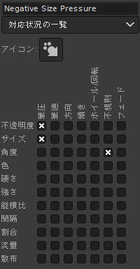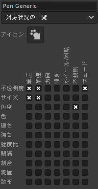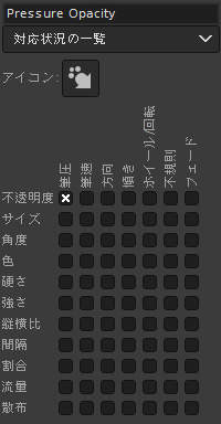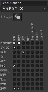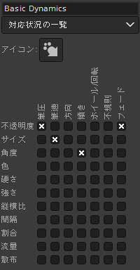 何度も説明しているように、GIMPの動的特性は入力機器(ペンタブレットやマウスなど)の筆圧や筆速に応じてブラシの特性を変化させるための機能です。