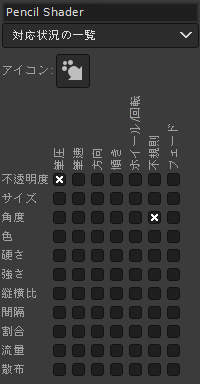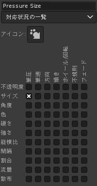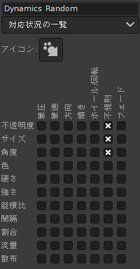 筆圧で塗りの不透明度 / 筆先の大きさが変化します。 また、筆先が不規則に回転します。