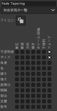 筆圧とフェード(ドラッグ距離)で塗りの不透明度が、筆速で筆先の大きさが変化します。 また、ペンの傾きに応じて筆先が回転します。