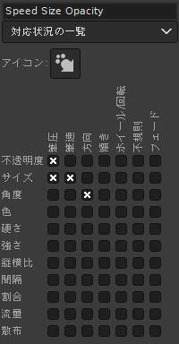 筆圧で塗りの不透明度 / 筆先の大きさ / 筆先の強さ / 散らばり具合が、筆速で塗りの不透明度 / 散らばり具合が変化します。 また、筆の移動方向に合わせて筆先が回転します。