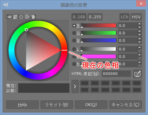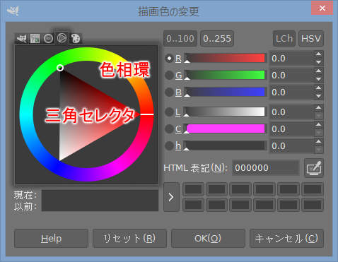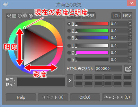 上図のように描画色の変更ウィンドウでは色相・彩度・輝度(明度)で色を設定することもできます。 色相を色相環で、彩度と輝度(明度)を三角セレクタで設定します。