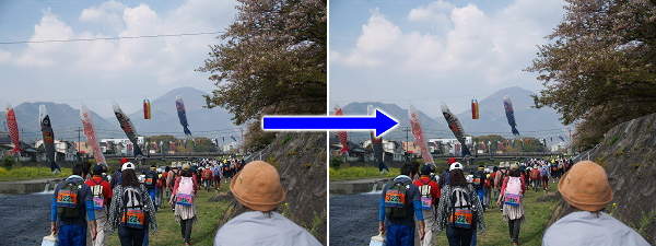 上図のように写真を開きます。 空に写り込んでいる太い電線が邪魔ですのでこれを消しましょう。 なお、鯉のぼりの後ろなどの目立たない電線はそのままにします。