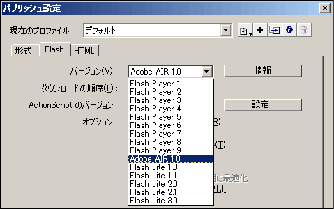 パブリッシュ設定の「Flash >> バージョン」を「Adobe AIR 1.0」に変更します。