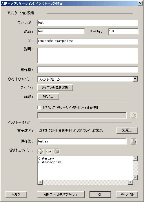メニューから「コマンド >> AIR - アプリケーションとインストーラの設定」を選択します。すると以下のようなダイアログが表示されます。