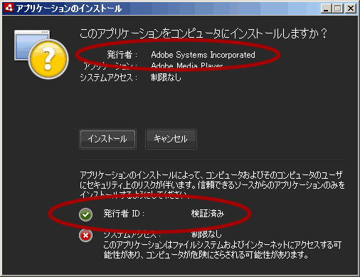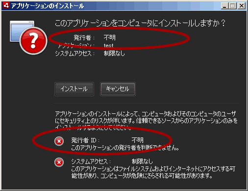 無料の自己署名証明書を使う場合は、インストール時に下のように発行者が「不明」扱いになり赤色の×マークで表示されるようです。