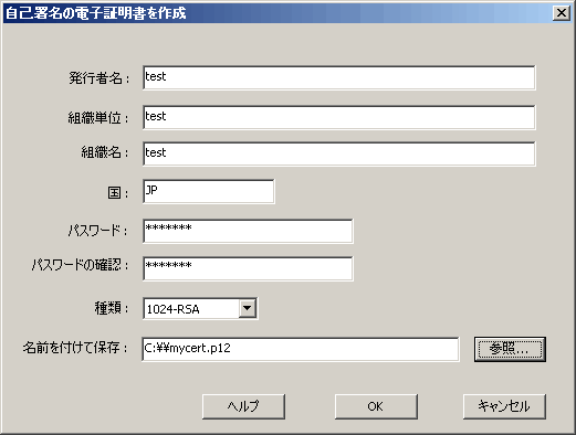そして「参照」ボタンを押して自己証明書ファイルを名前を付けて保存します。