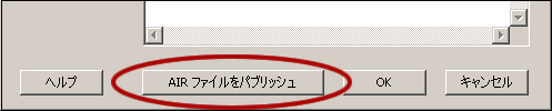 すべての記述が終わった後に、一番下の「AIR ファイルをパブリッシュ」ボタンを押すと、インストーラがFlaファイルと同じディレクトリに作成されます。