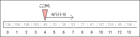 続けて、readInt() メソッドを使用すると、 4 から 7 番地までの 4 バイト分のデータが読み取られ、整数値として取得できます。