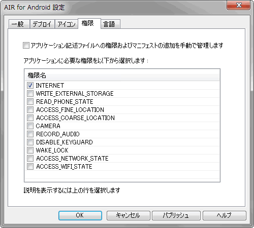 「AIR for Android」でネットワーク機能を使用するには、以下のパーミッション設定を追加する必要があります。
