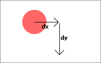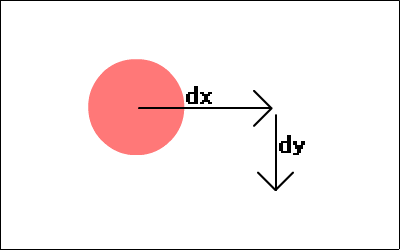 1フレームで座標が変化する量⇒速度を、変数 (dx, dy) とします。