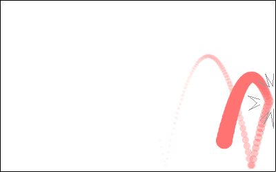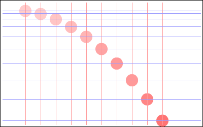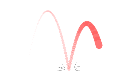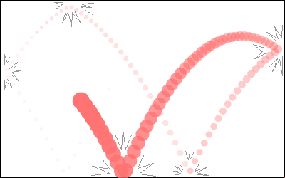 例) ムービークリップ mc の放物線運動に壁の反射を追加する(Flash MX 以降)
