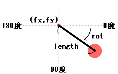 重りの x 座標 = fx + Math.cos(rot * Math.PI / 180) * length;