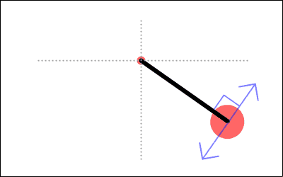 重力は真下方向に働きますが、振り子は強固な棒で構成されている為、重りの移動する方向は円を描くような方向に変換されます。この振り子運動を発生させるベクトルを調べてみます。