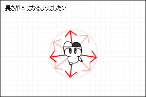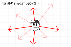 移動量が5以上のときは 5 に戻すようにします。まず、現在の移動量の長さを調べます。